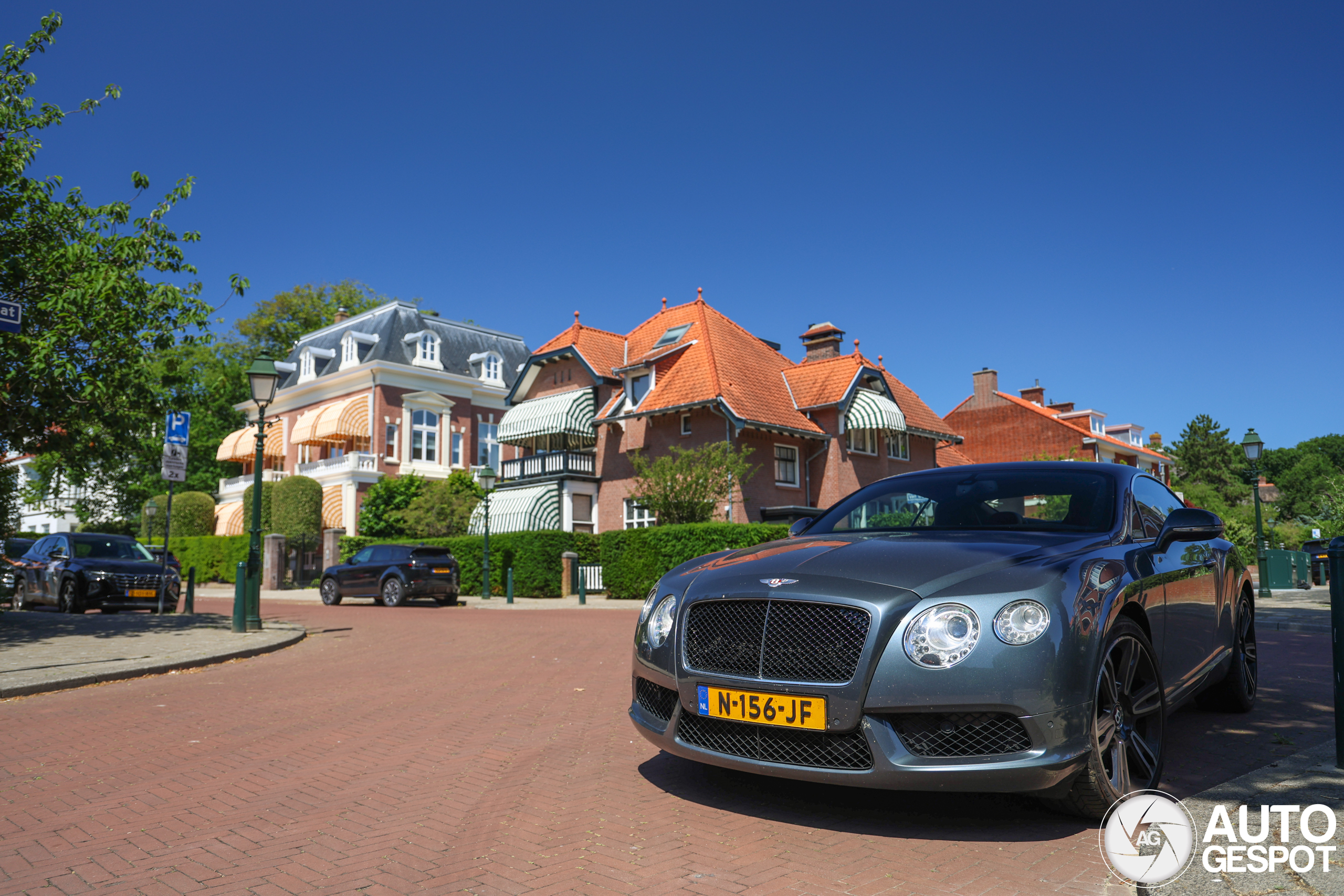 Mooie Bentley op een fraai pleintje, in goed gezelschap! Er stonden ook nog een Aston Martin V8 Vantage en een Porsche 992 Targa 4S.