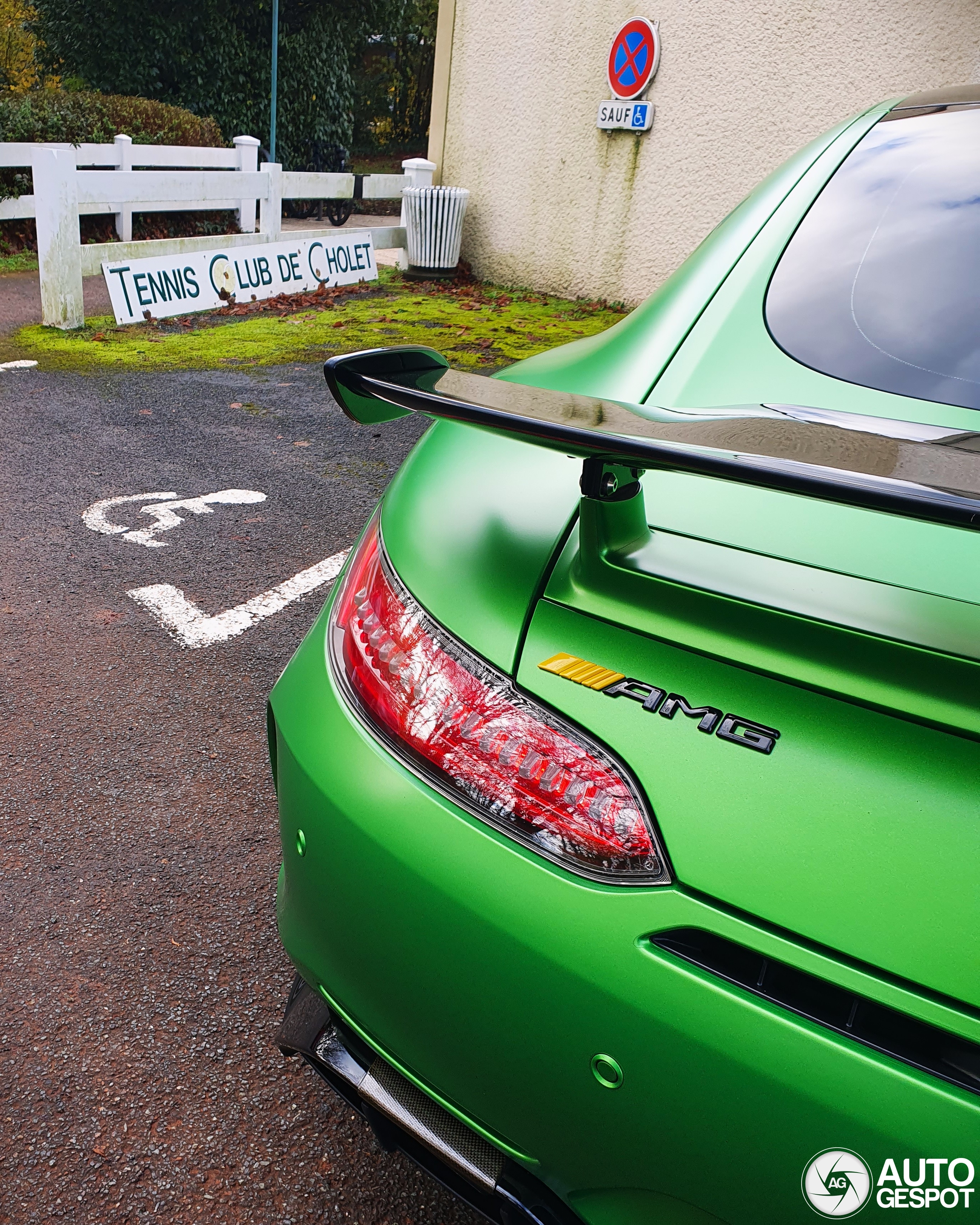 Je l'avais déjà vu quelques fois sans prendre de photos, mais en me rendant au TennisClubCholet j'ai eu la chance de la trouver ! Elle est magnifique, surtout avec la couleur spéciale AMG Green Hell et les freins carbone céramique aux étriers dorés !!